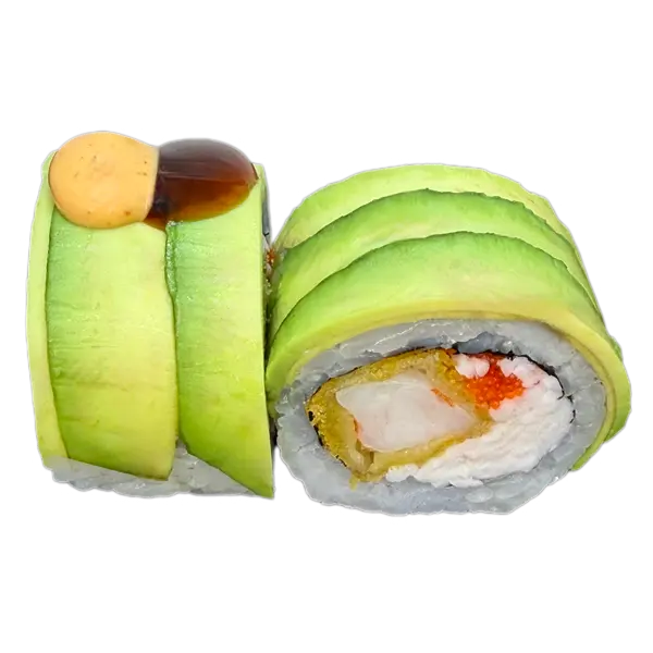 Грин ролл с креветкой темпура – это симфония вкуса, где нежный рис встречается с хрустящими нори, а сочная креветка темпура танцует в объятиях авокадо. В его сердце таится снежный краб, а пикантные нотки икры масаго, соуса «Спайси» и бархатистого соуса «Унаги» завершают эту гастрономическую поэму.