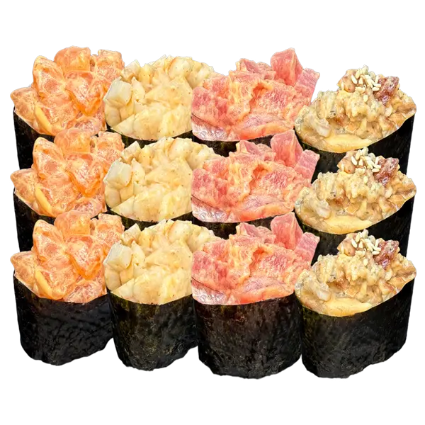 Погрузитесь в океан вкуса с нашей изысканной коллекцией гункан-суши. Насладитесь нежным атлантическим лососем, сочной креветкой, тающим во рту угрем и пикантным тунцом. В каждой порции — по три гункана каждого вида, чтобы вы смогли в полной мере оценить разнообразие морепродуктов. Идеальный выбор для истинных ценителей японской кухни.