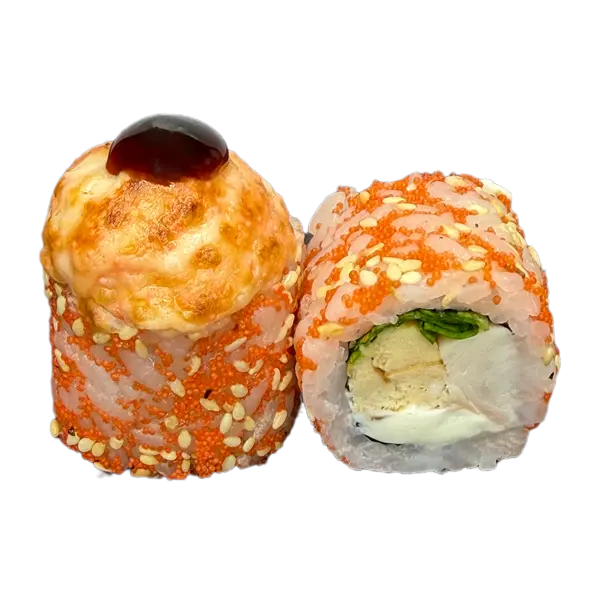 Запеченный ролл с курицей – изысканное сочетание копченой куриной грудки, нежного творожного сыра и хрустящего салата айсберг, искусно завернутых в ароматный рис и хрустящие нори. Этот запеченный ролл, увенчанный искрящейся икрой масаго и обжаренным белым кунжутом, раскрывает богатство вкусов благодаря пикантной шапочке и соусу «Унаги».
