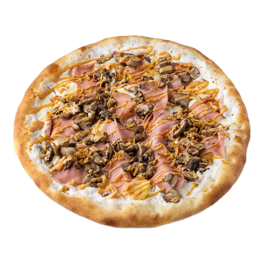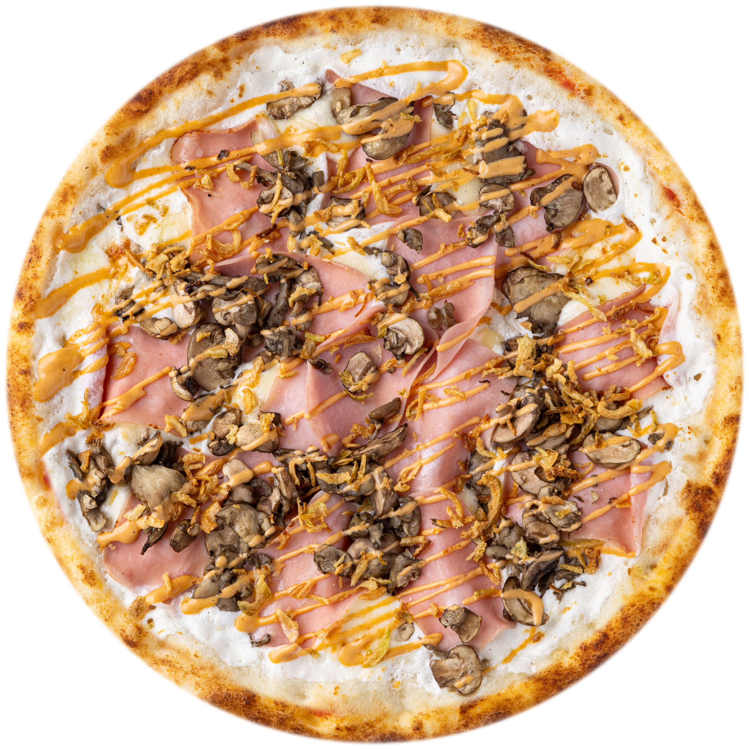 Пицца «Ветчина и грибы» — это классическое сочетание нежной ветчины и ароматных грибов, нежного сливочного соуса и расплавленного сыра моцарелла на тонкой основе. Каждый кусочек пиццы дарит сбалансированный вкус, идеальный для любителей традиционных пицц.
