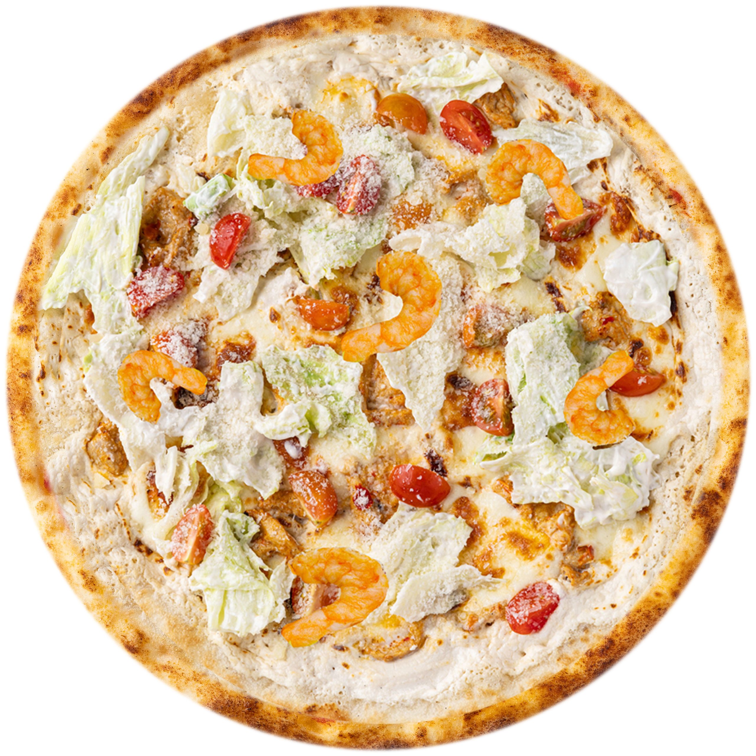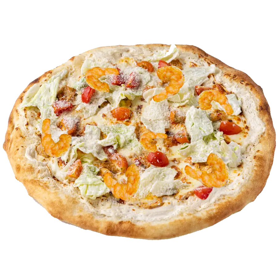 Пицца «Цезарь с тигровыми креветками» — это тонкое тесто с нежным сливочным соусом, нежное мясо тигровой креветки, свежими черри и хрустящим салатом айсберг. Всё завершается щедрой порцией тертого пармезана, создавая идеальное сочетание вкусов и текстур в каждом кусочке.
