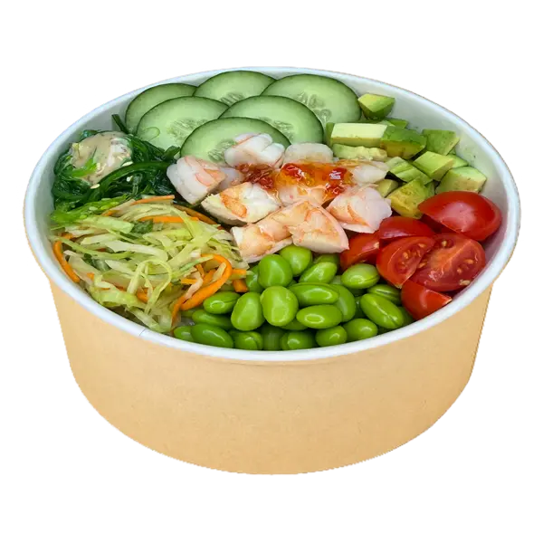 Рис, вареная креветка , огурец, авокадо, помидоры черри, бобы эдомамэ, капуста б/к, морковь, чука, лук зеленый,соус «Ореховый», соус для Поке.