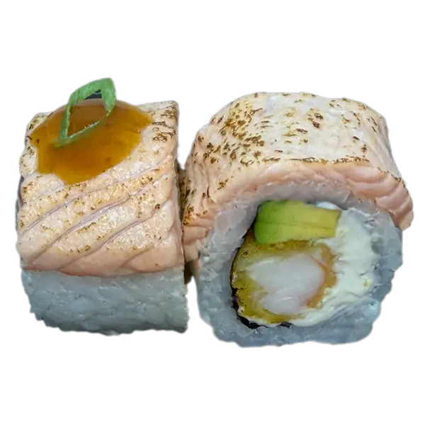 Нежнейший лосось, обжигаемый пламенем до едва уловимой корочки, встречается с хрустящей, воздушной креветкой темпура, создавая волшебный контраст текстур. Сливочный творожный сыр плавно обволакивает начинку из сочного авокадо и пикантного зеленого лука. Все это великолепие укутано в шелковистые нори и рассыпчатый рис, подчеркнутое ярким акцентом соуса «Манго-чили».